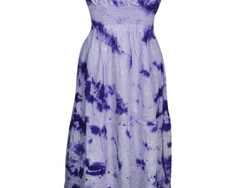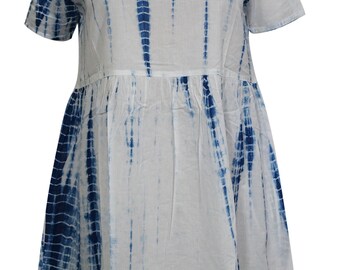 Women Boho Dress, White Blue Tie Dye Flare Dress, Bohemian Summer Cotton Retro Boho Dresses M