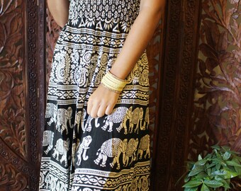 Only 2 leftBoho Cotton Maxi Dress Sleeveless With V Neck Elephants On Parade Gypsy Hippie Chic Summer Dresses M/L