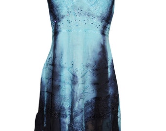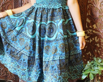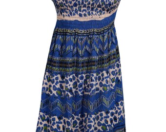 Womens Boho Ruffle Dress, Blue Printed Beach Dress, Spaghetti Strap Recycled Sari Dresses, Summer dresses SM