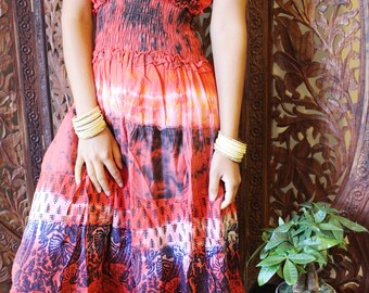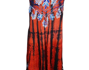 Womens Sundress, Housedress, Summer Tie Dye Red Embroidered Bohemian Sleeveless Flared Tank Dress M