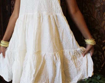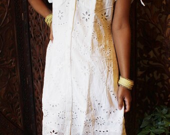 Only 1 leftWomens Floral Cutwork Shirt Dress, White Cotton Boho Dress, Bohemian Handmade Summer Fashion M