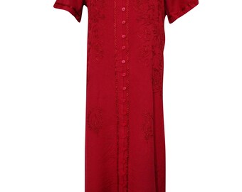 Women's Maxi Dress, Red Embroidered Button Front Long Evening Dresses Summer Style Plus Size 3X