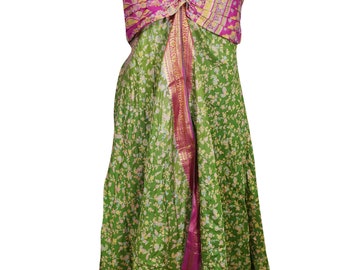 Bohemian Womens Resort Beach Dress Green Spaghetti Strap Recycled Sari Vintage Printed Summer Holiday Sundress S/M
