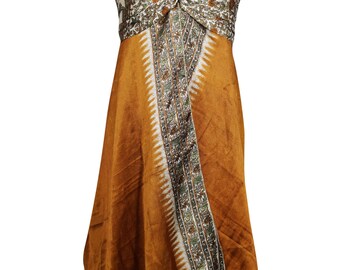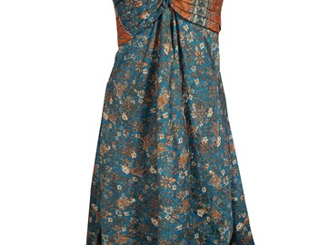 Womens Boho Tank Dress, Beige Floral Dress ,Beach Dress, Recycled Sari Printed Spaghetti Strap Dresses SM