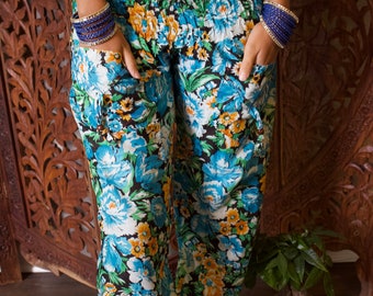 $22.77Women's Blue Floral Pants, Casual Pant Wide Leg Printed Trendy Summer Cotton Boho Harem Pants SM