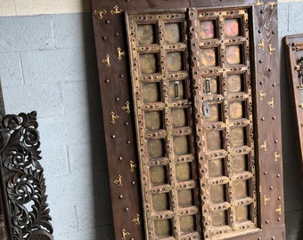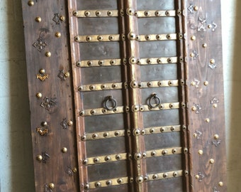Antique Brass Rustic Armoire, Farmhouse Wine Chest , Hand Carved Indian Doors, Huge Wardrobe Cabinet