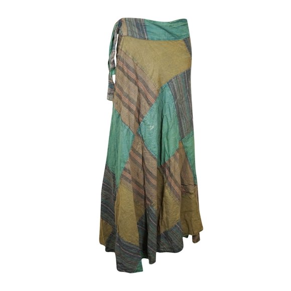 Hippie Khaki Cotton Long Wrap Skirt Printed Mixed Patchwork Wrap Around Skirts