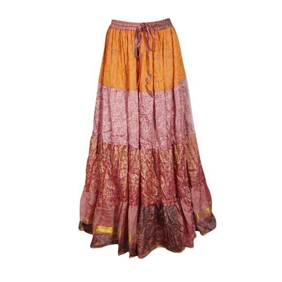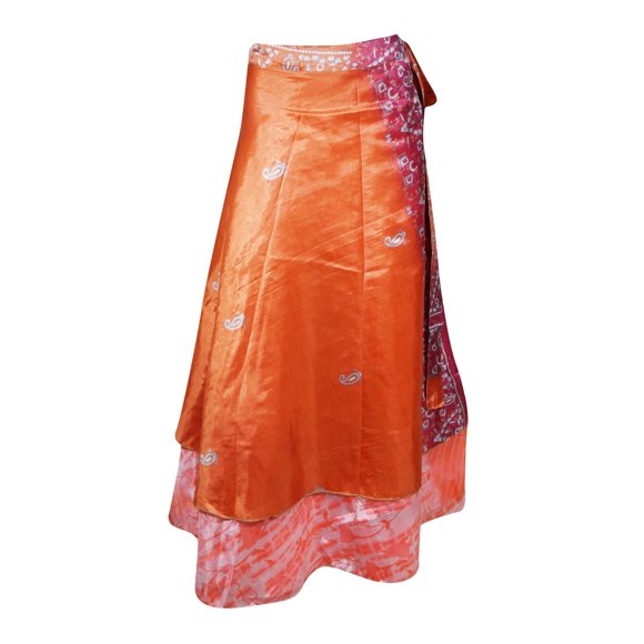 Handmade Recycled Silk Wrap Skirt Orange Pink Print Layered Beach Skirt