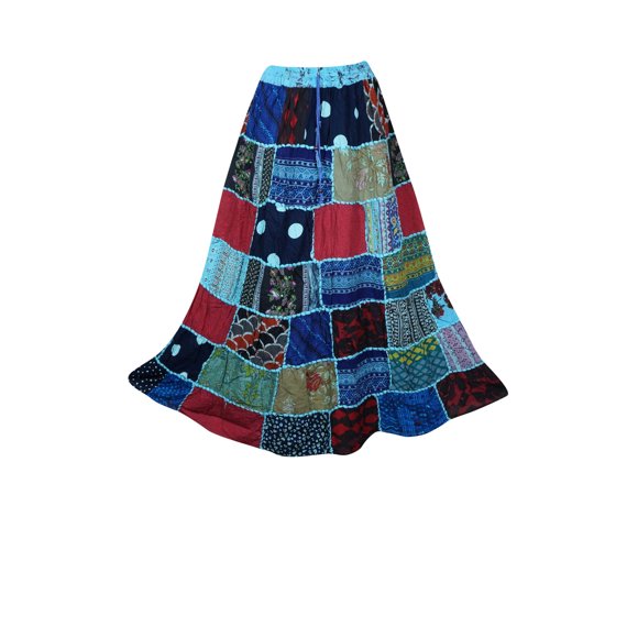 Patchwork Long Skirt, Bohemian Gypsy Chic Blue Printed S/M