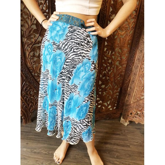 MAXI Skirt,Blue Floral PRINTED, Bohemian Recycled Sari Full S/M